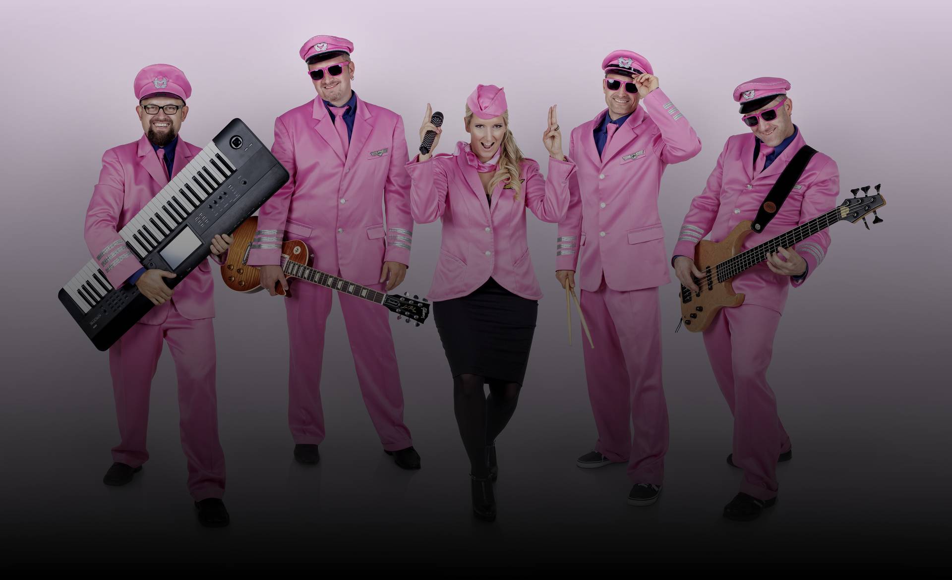 Auf Wunsch spielt die Partyband aus Stuttgart auch in Ihrer amüsanten, mit einem Augenzwinkern versehenen Kostümierung - als pinkfarbene Flugzeugcrew! Das ist immer ein toller Eyecatcher für Ihre Veranstaltung. Bei vielen Events wird die Band aber auch in „zivil“ gebucht.