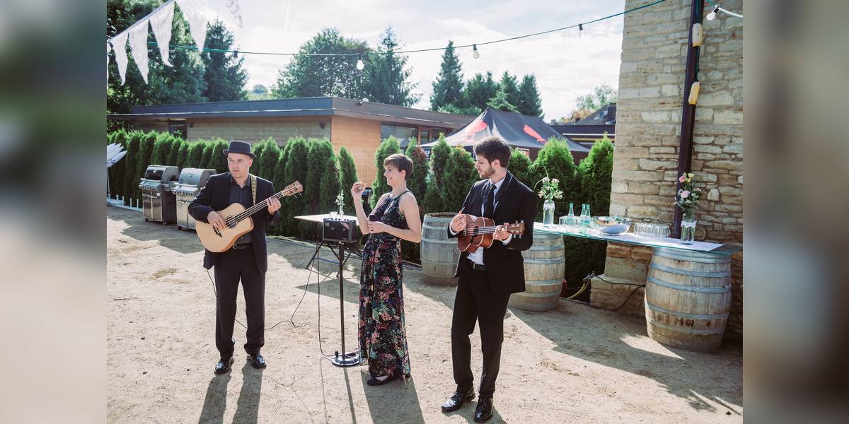 Flexibility: The trio lineup allows for high flexibility in controlling volume and space, yet sounds like a complete live band. Professional quality: Many years of experience in the event sector and completed music studies of all musicians guarantee a musical experience of the highest quality, as well as professional support from the first contact to the on-site performance. Your wishes and ideas are our focus. Individuality: By one or the other own arrangement and the trio setting known songs sound new and refreshing, but are still ideally suited for singing along. Walking Act: A great highlight is our short walking act. With acoustic vocals and ukuleles, bongos and shakers, we do not need electricity and are mobile.
