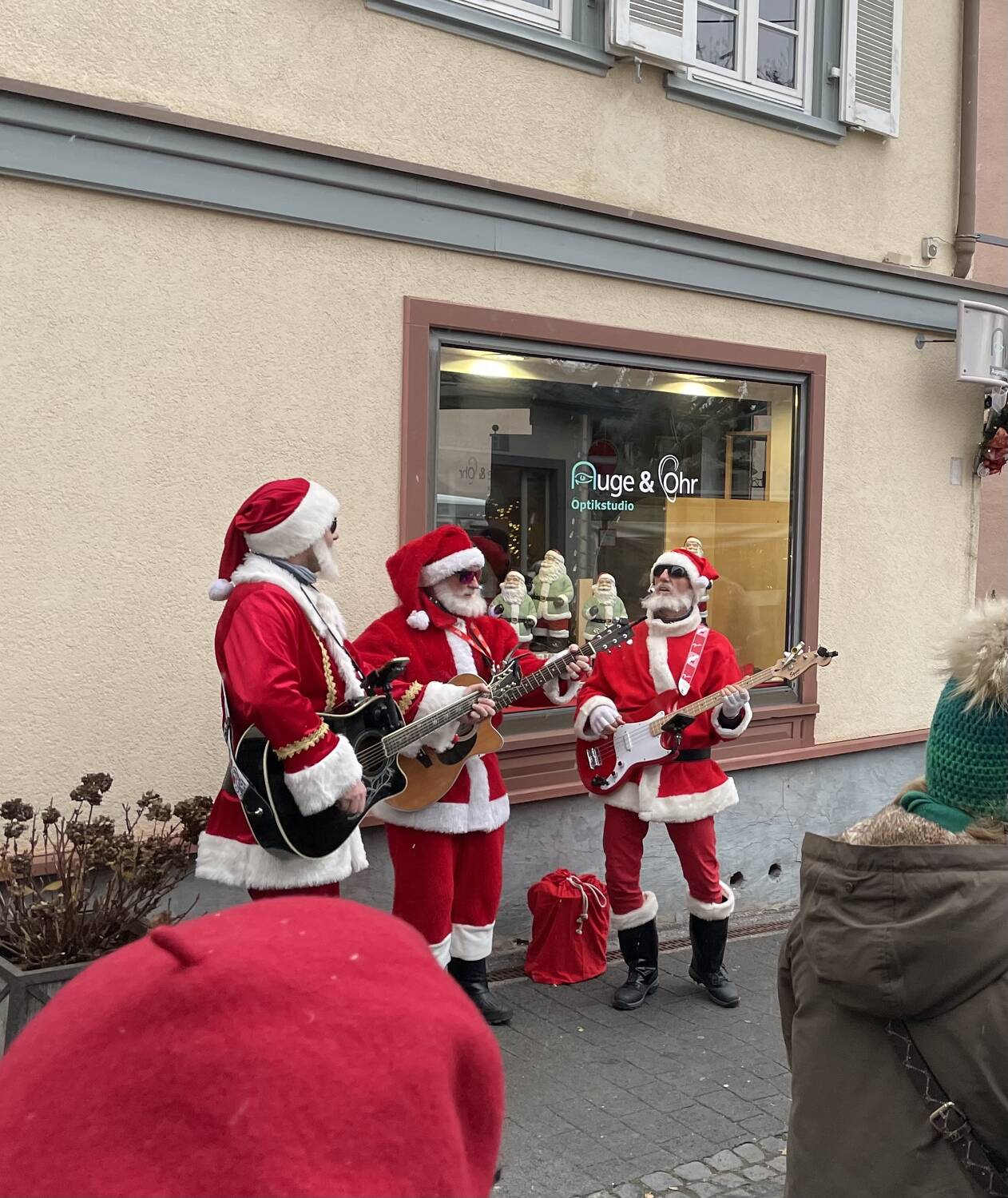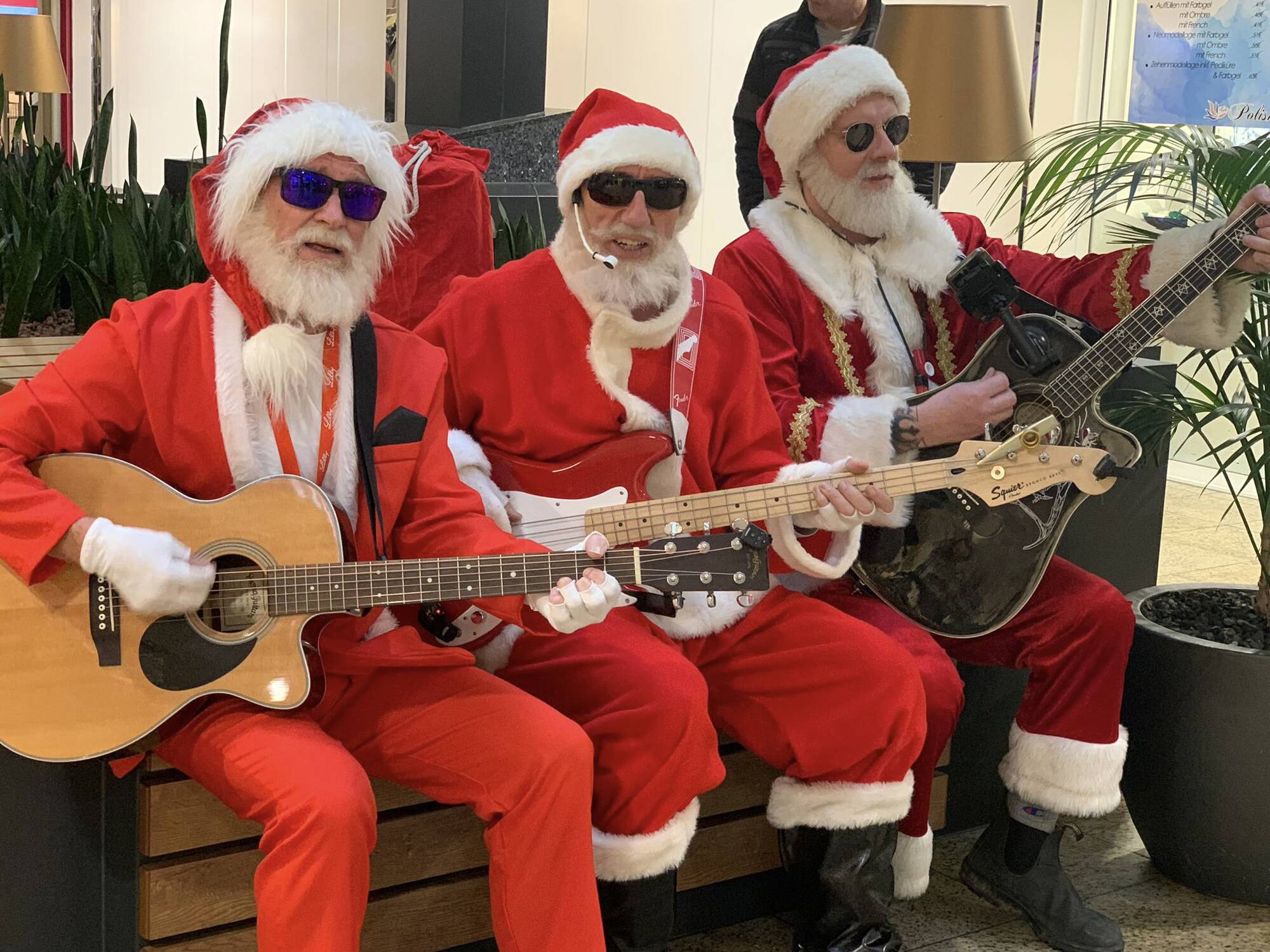 Die Walking Santas treten als Trio auf. Auch ein Quartett mit zusätzlichem Cajon-Spieler ist möglich.